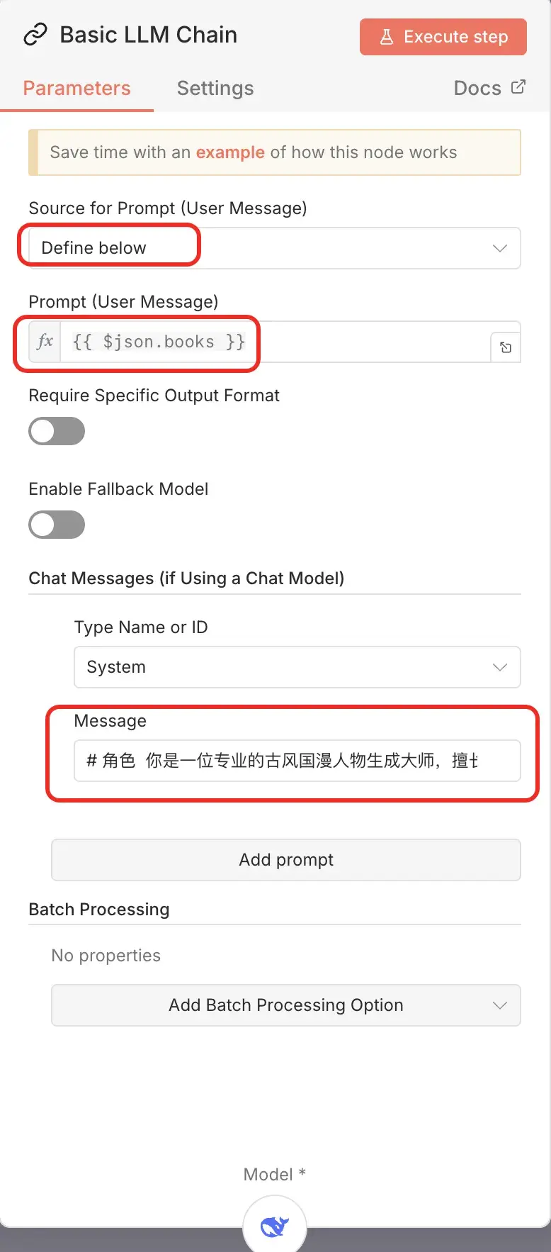 这个工作流的核心就是 Agent 节点,我们选择 AI 类型中的 Basic LLM Chain 节点进行演示,模型使用 DeepSeek,用户提示词引用表单中的 books 字段,系统提示词使用我们上一章设计的内容。