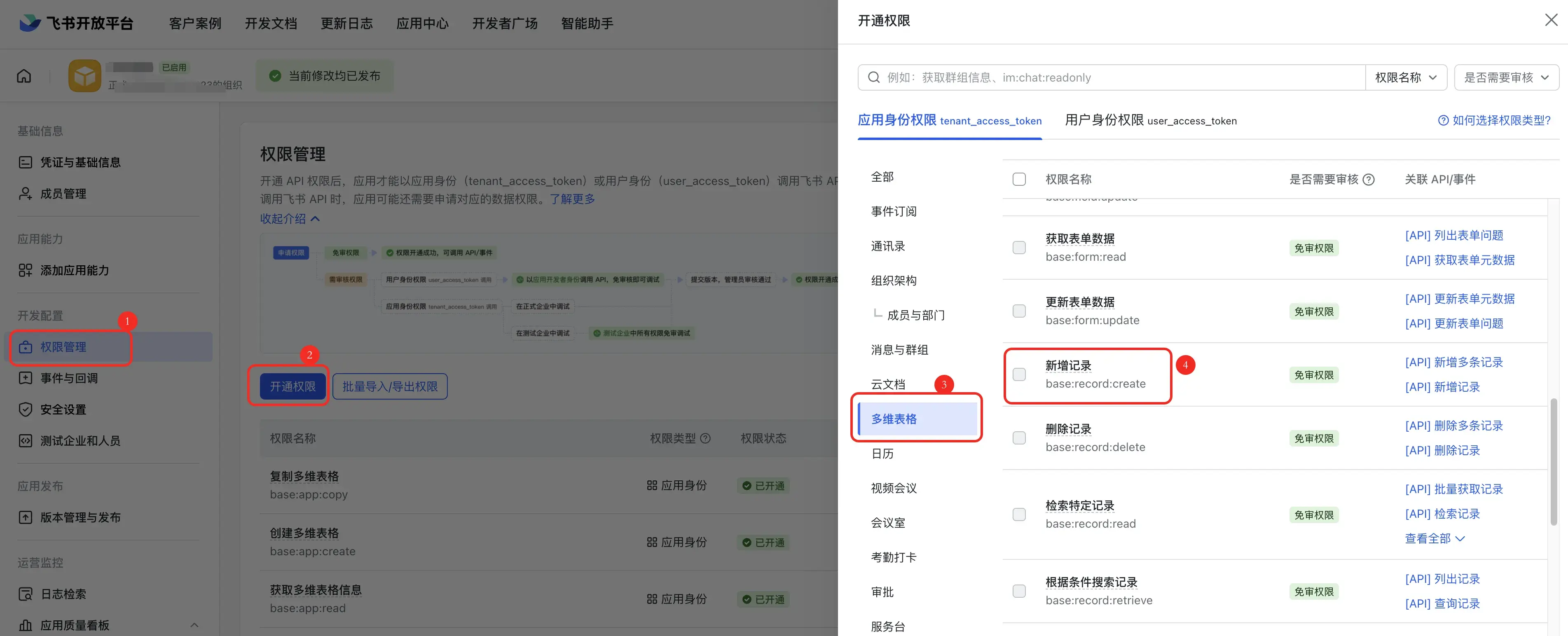 点击应用的权限管理 → 开通权限 → 找到多维表格 → 勾选新增记录就可以了,这里我是为了测试方便就把权限都给加上了。。