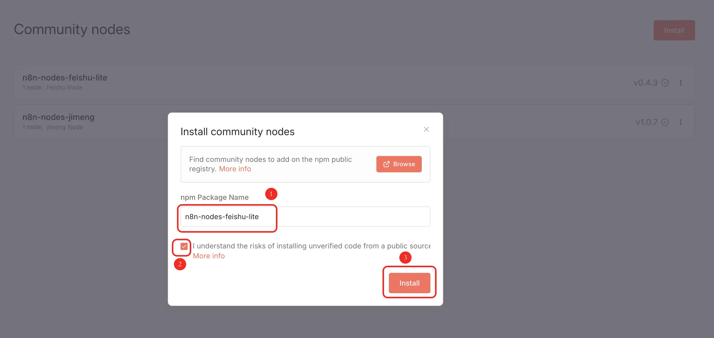 安装飞书节点:在 npm Package Name 中填写:n8n-nodes-feishu-lite 然后点击勾选下面提示框,最后点击 Install 按钮,稍等一会即可安装完成。