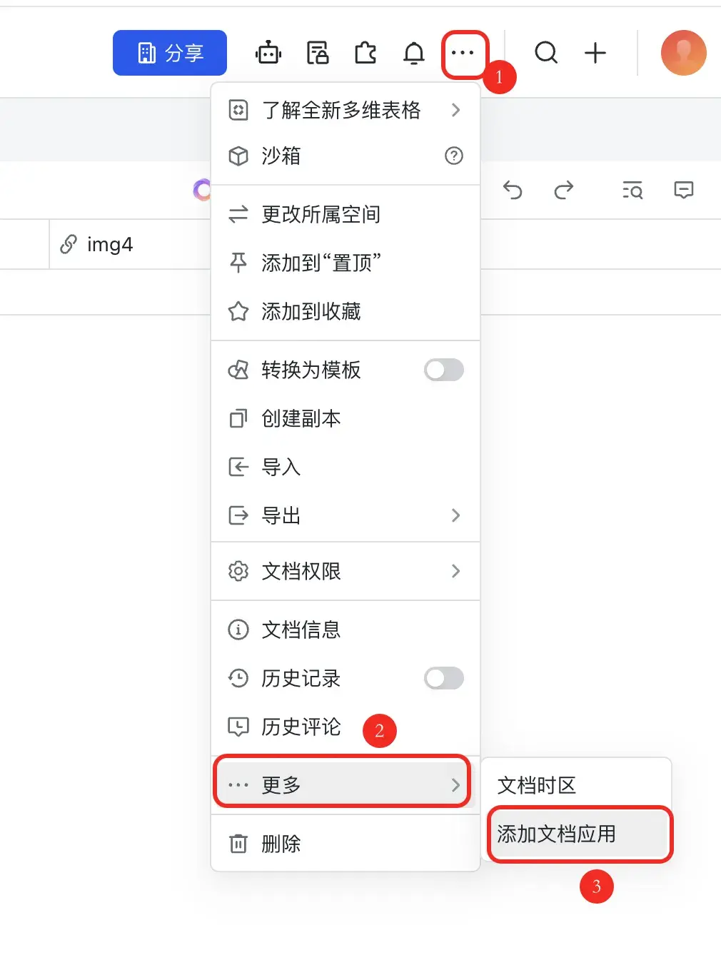 点击右上角的菜单选项 → 更多 → 添加文档应用
