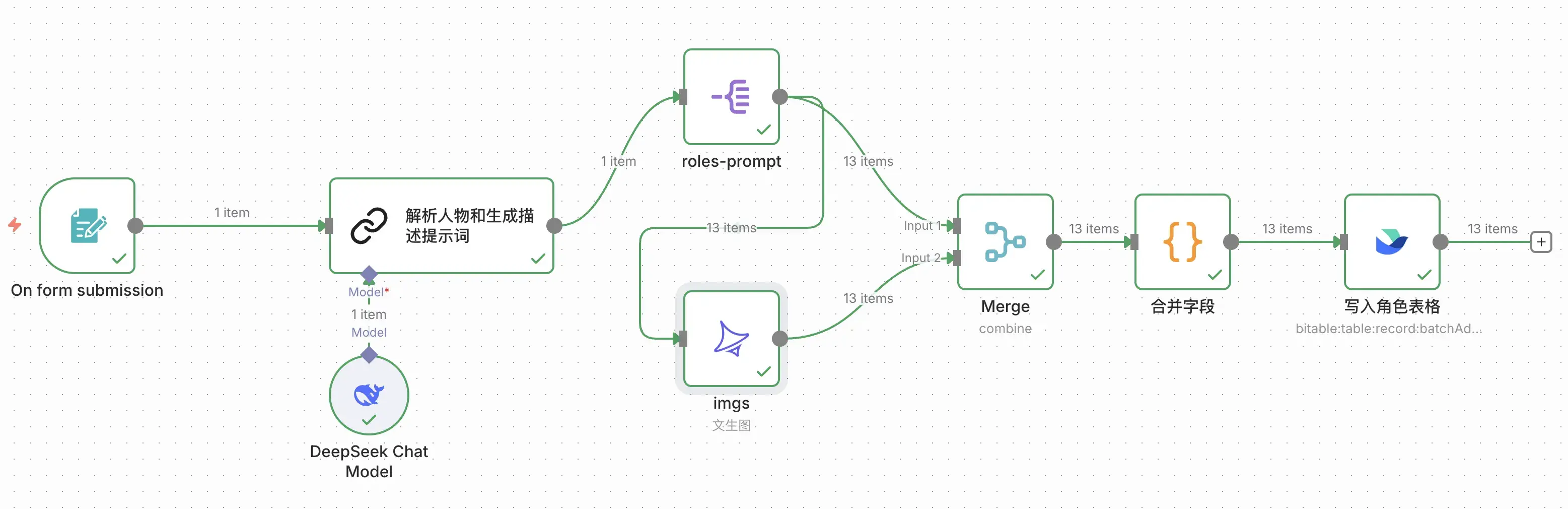 这里我们需要再添加一个合并节点,等待生图完成后,再将图片链接和提示词合并到一起,最终写入到飞书多维表格。