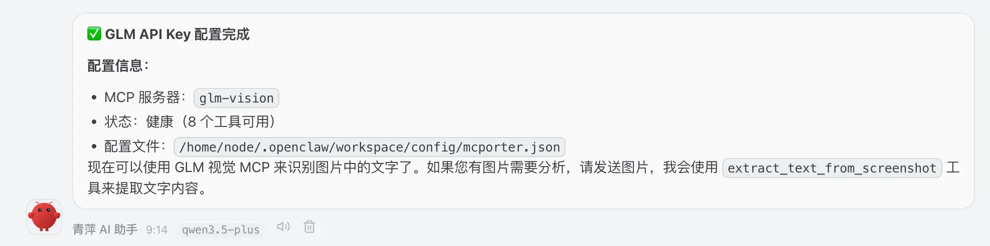 GLM 视觉需要智谱的 API Key。如果你已经有 Key,告诉 OpenClaw 帮你配置: