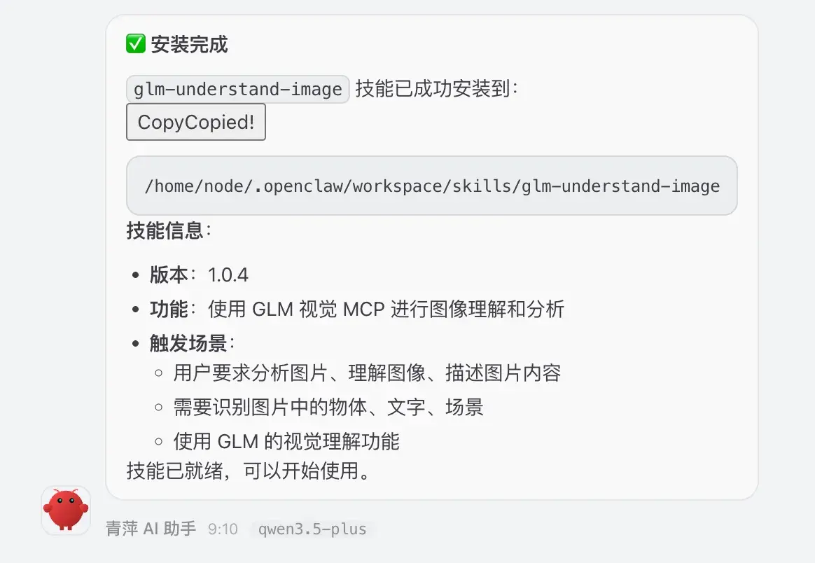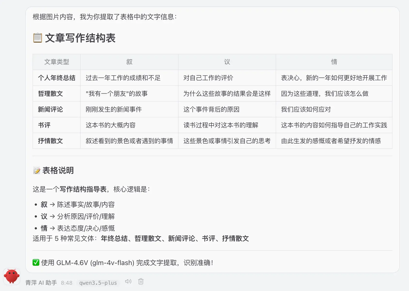 AI 会自动调用 GLM 视觉模型,分析图片并返回识别结果。