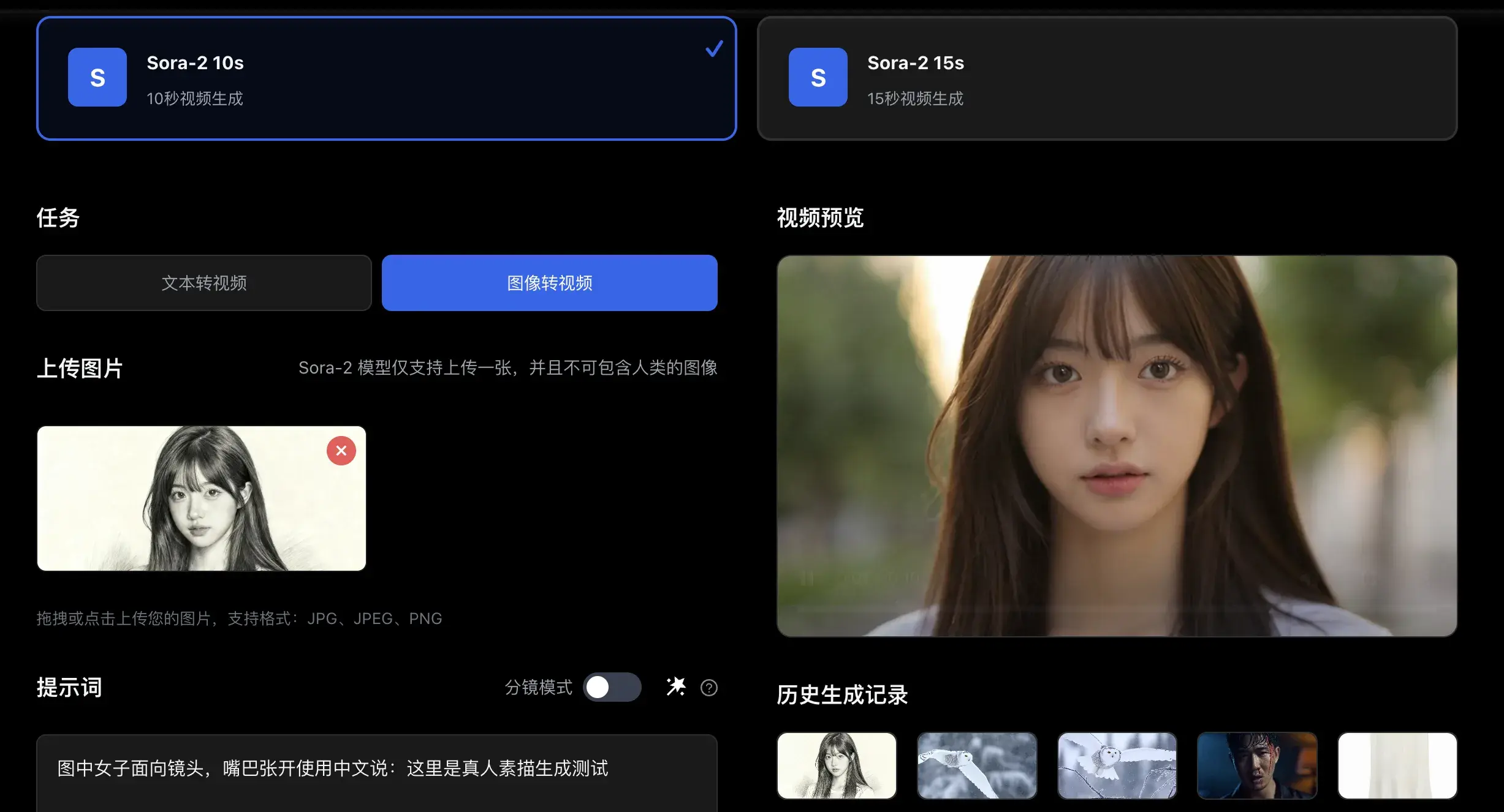可以发现直接就能生成成功了,并且除了首帧会是素描以外,后面都是还原回了真人。