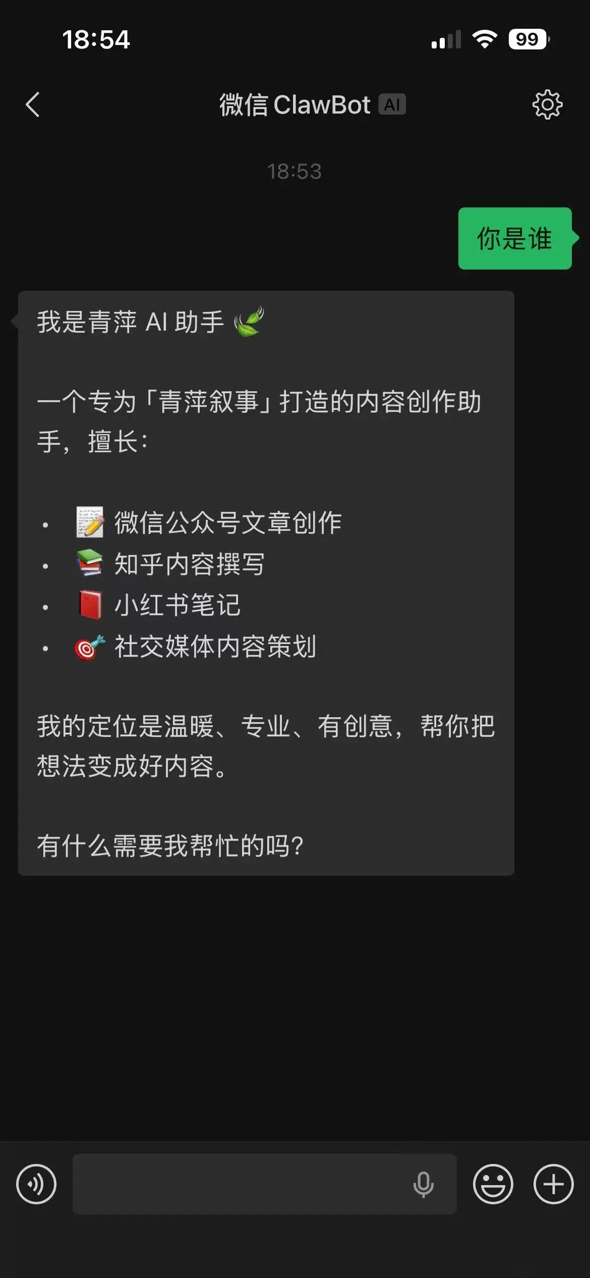 你打开微信,给 Claw 助手发消息: