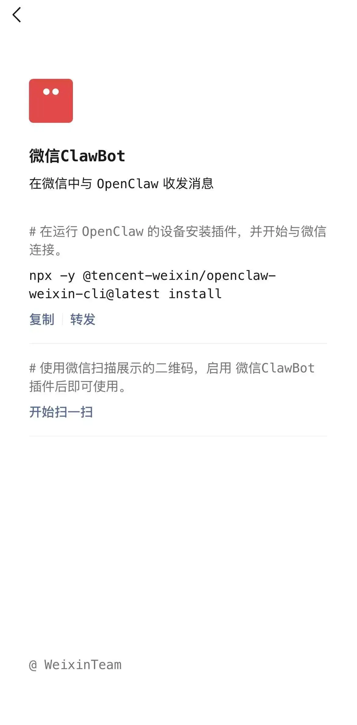 1 | npx -y @tencent-weixin/openclaw-weixin-cli@latest install |